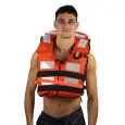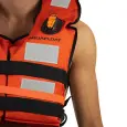 Fabricado en poliéster 100%, recubierto con acrílico, con relleno de espuma de celda cerrada (polietileno expandido) que a comparación de los otros chalecos DAF viene con mayor proporción de relleno, 8 parches de cinta reflectiva, 2 tiras de polietileno con hebillas de resina acetal, agarradera en la parte superior para facilitar el rescate y silbato. Aprobado por la PNA para el equipamiento de embarcaciones mercantes. COMPOSICIÓN • Hilado de poliéster. • Urdimbre: Liso. • Columna de agua: 500 ml. • Parches reflectivos • Silbato de 2 tonos con base. • Repelencia al agua con tratamiento con fluocarbono • Cinta de polipropileno. • Relleno de espuma de polietileno cell-aire con estructura de celda cerrada.