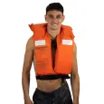 Fabricado en poliéster 100%, recubierto con acrílico, relleno de espuma de celda cerrada (polietileno expandido) y viene con cinta de Polipropileno para ajustar el chaleco al cuerpo. No apto para uso en deporte de alta velocidad. Modelo sin cintas reflectivas: Aprobado por PNA como DAF. Modelo con cintas reflectivas: Aprobado por PNA como Chaleco Salvavidas. COMPOSICIÓN • Hilado de poliéster. • Urdimbre: Liso. • Columna de agua: 500 ml • Repelencia al agua con tratamiento con fluocarbono. • Relleno de espuma de polietileno cell-aire con estructura de celda cerrada. • Cinta de polipropileno. • Parches reflectivos. • Silbato de 2 tonos con base