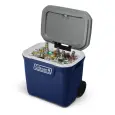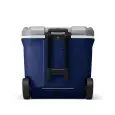 Mantiene el hielo hasta 4 días. 61.5 litros de capacidad, almacena hasta 108 latas. Ruedas resistentes de 6 pulgadas. Manijas telescópicas embutidas. Portavasos en la tapa. Incluye tapón de desagote. Medidas: 42 x 57 x 54 cm Peso: 5,8 kg