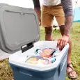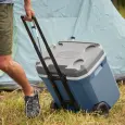Mantiene el hielo hasta 4 días. 61.5 litros de capacidad, almacena hasta 108 latas. Ruedas resistentes de 6 pulgadas. Manijas telescópicas embutidas. Portavasos en la tapa. Incluye tapón de desagote. Medidas: 42 x 56 x 50 cm Peso: 5,8 kg